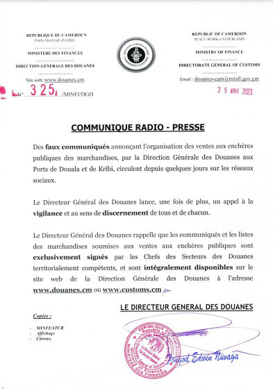 FAUX COMMUNIQUES DES VENTES AUX ENCHERES PUBLIQUES DES MARCHANDISES