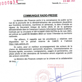 COMMUNIQUE 329/MINFI/DGD PORTANT SUR LE DYSFONCTIONNEMENT INATTENDU DE L INFRASTRUCTURE DU SYSTEME D NFORMATION DE LA DIRECTION GENERALE DES DOUANES (CAMCIS)